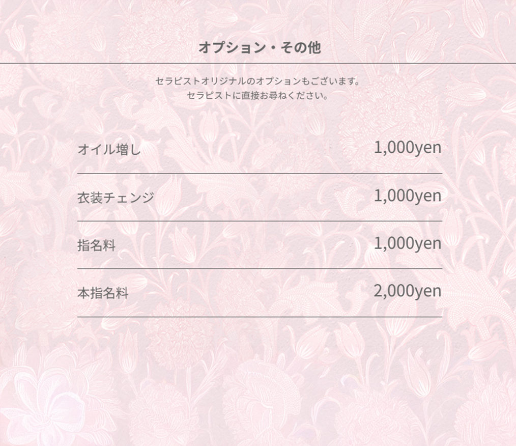 当店は本格的なアロマセラピー及びエステをご提供するサロンであり、風俗的なサービスは一切行っておりません。